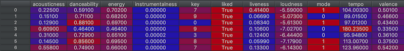 In my case, I had to label my dataset, by deciding if I like the song (1) or I dislike the song (0). So my dataset would consist of the different features (energy, danceability, etc.) and the label I manually assigned to the dataset (liked=False).
