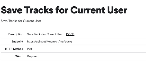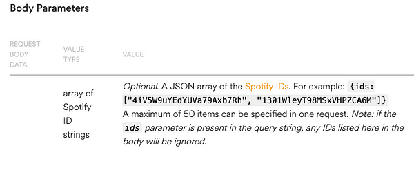 We need to generate a PUT request. This time we have to provide a body, which has to include an array of Spotify ID strings. We will only include on ID in this array because we are going to generate a request for every song.